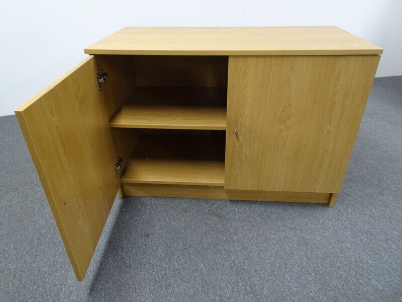 2 Door Cupboard in Oak with silver handles and one height adjustable shelf. This is a non-lockable storage unit.