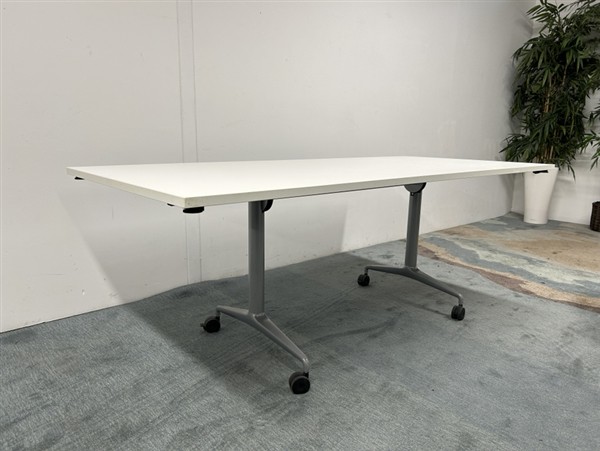 Connection White Flip Top Tables are large, mobile tables with a white laminate top, silver leg assembly, linking brackets and lockable castors.