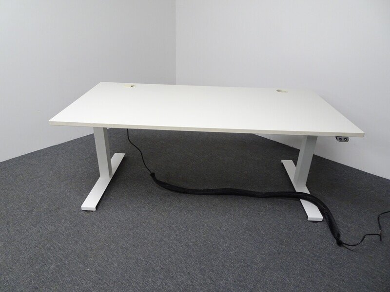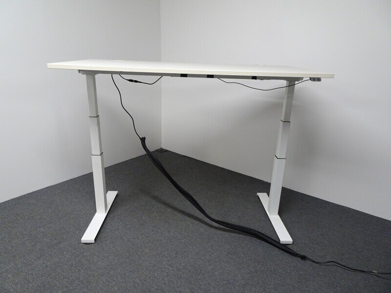 A white electric desk frame with a twin motor and width adjustable beam. Supports a variety of desktop sizes for a custom standing desk.