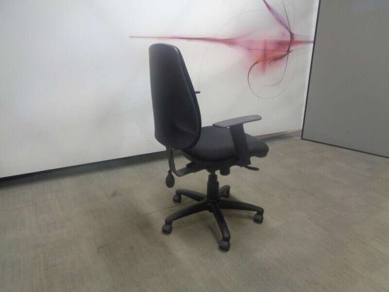 Black fabric operator chair featuring a lumbar pump, height adjustable seat and arms, back recline, and a black 5 star base.