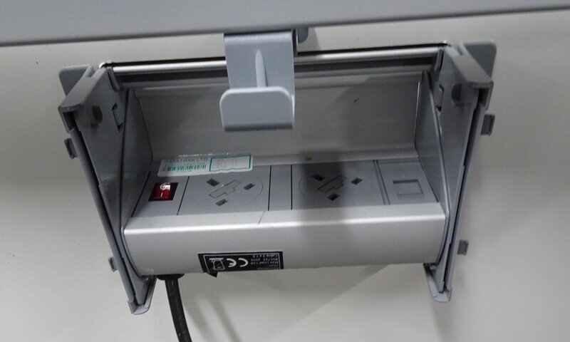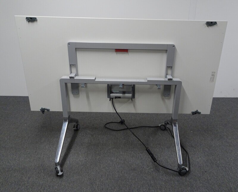 This versatile flip-top table features a clean, white tabletop supported by a durable grey frame and stylish chrome legs. Designed for flexibility, it includes lockable castors for easy mobility and secure placement, while linking brackets allow for connection to other tables to create larger configurations. An integrated electrics panel, located in the rear center of the tabletop, provides convenient access to two power points. Please note that all electrical components should be inspected and approved by a qualified specialist before use.