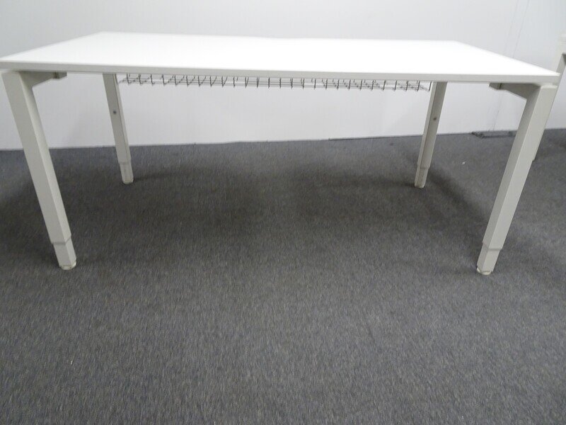 Freestanding Desk with a white frame and goalpost legs. This desk includes a second-hand white top with a rear scallop and a cable tray.