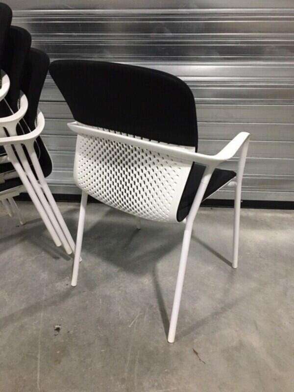 Black Herman Miller Keyn 4 leg stacking chair. An armchair with a black fabric seat and back, a white frame, and a perforated back.