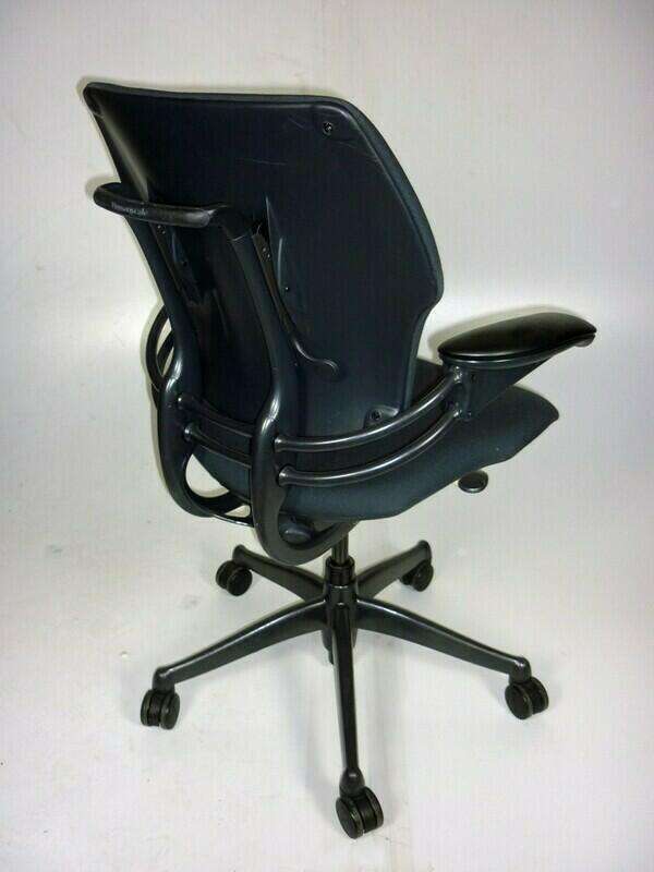 Humanscale Freedom mid-back task chair in grey. Features graphite grey cloth upholstery, gel armrests, and adjustable back, lumbar, and seat.
