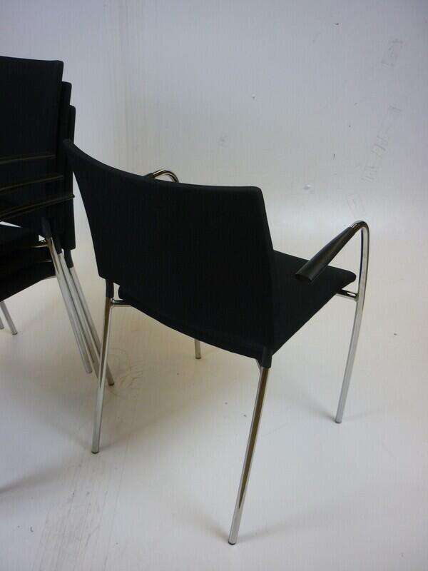 Lammhults Spira stacking chairs with a black fabric seat and back and chrome legs and arms.