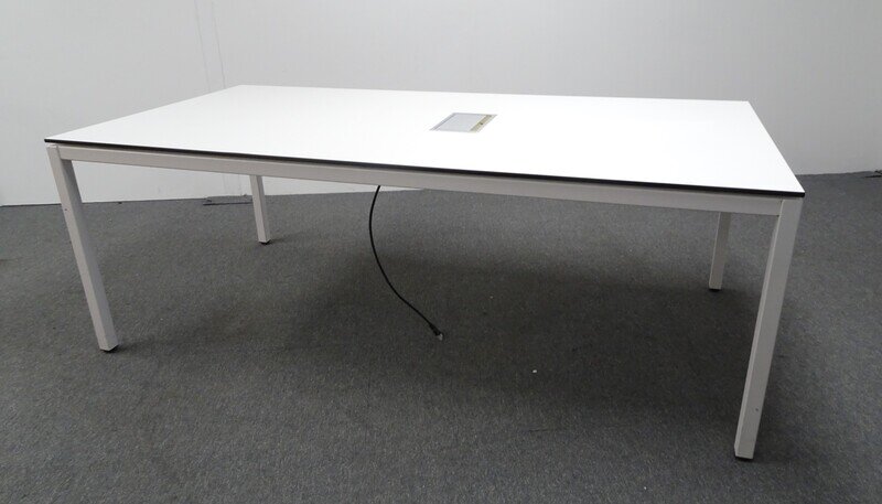 Meeting table with a white top, black edging, and white goalpost legs. Features an electric insert with power points and data ports.