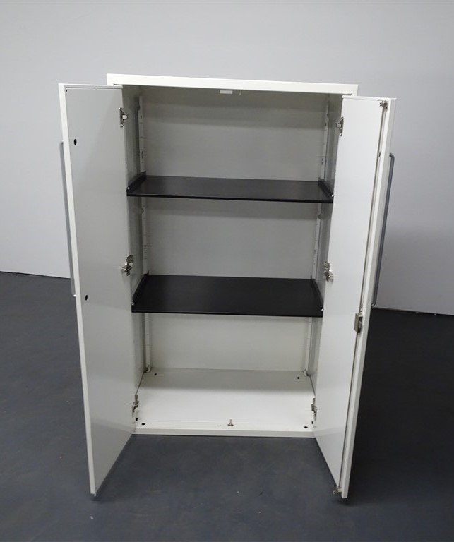 Off white metal cupboard featuring two doors with silver handles and two height adjustable shelves.