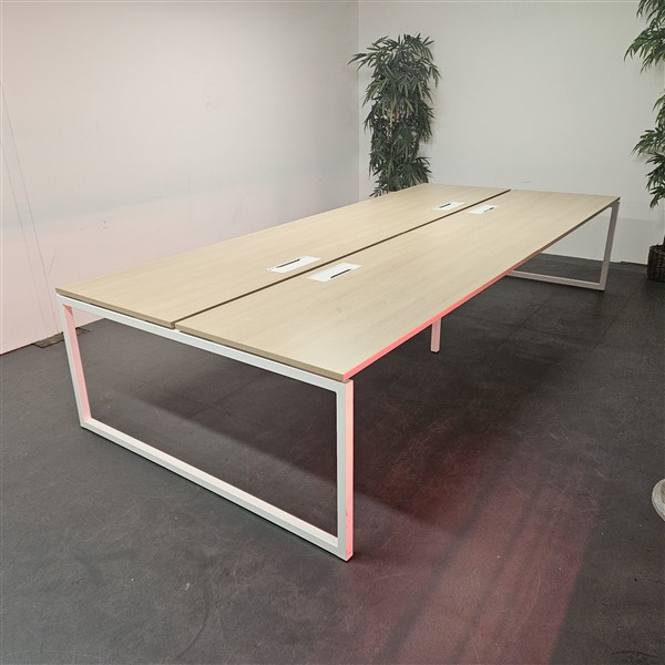Second-hand Oak Bench Desks with natural oak tops and modern white frames. These office desks include integrated cable access ports for organisation.