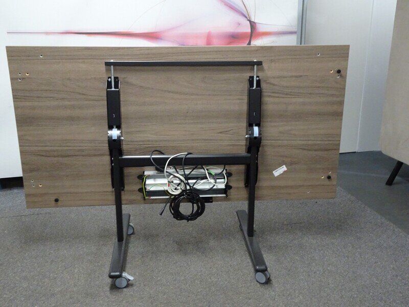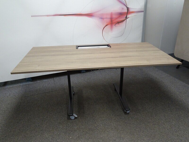 Oak Flip Top Table with a black frame and legs. This mobile table features lockable castors and an access panel with power, USB, and ethernet.