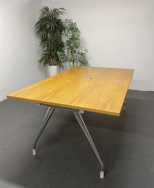 Rectangular Oak Meeting Table with a thick oak tabletop and chrome leg frames. Features a central cable access port for tidy cable management.