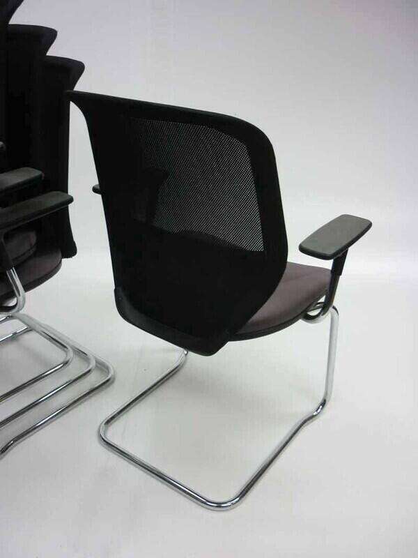 Orangebox Joy stacking chairs with a grey fabric seat, black mesh back, and arms on a chrome cantilever frame. These chairs are stackable.