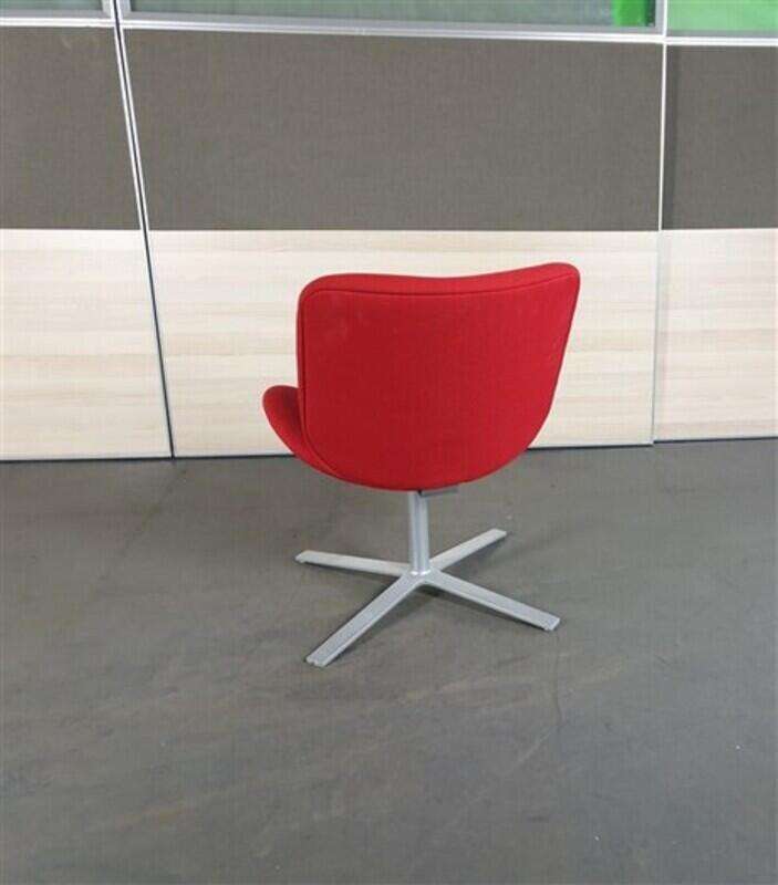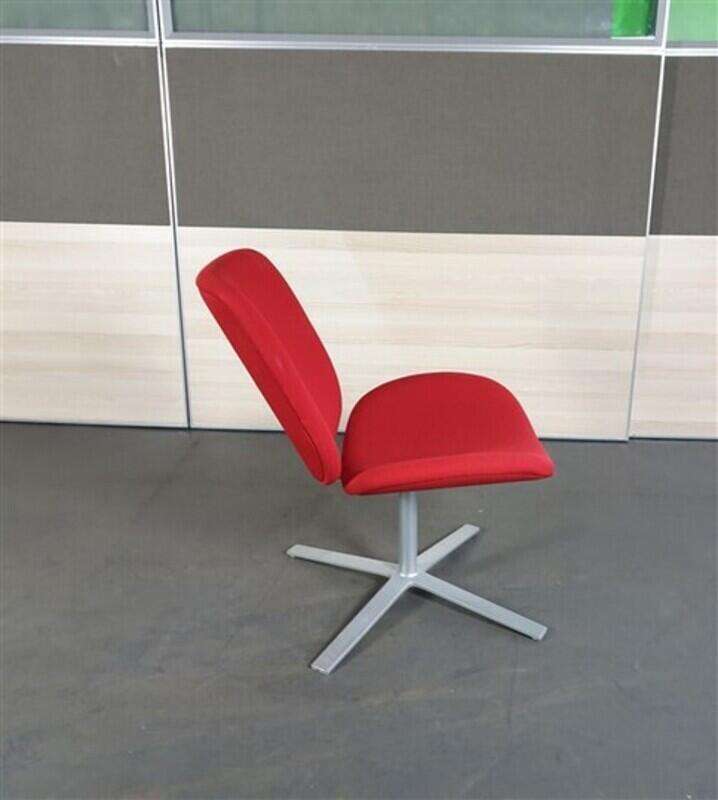 Orangebox Track Red Swivel Fabric Chair. A low breakout chair with red fabric upholstery, an angled back, and a flat 4-star chrome base.