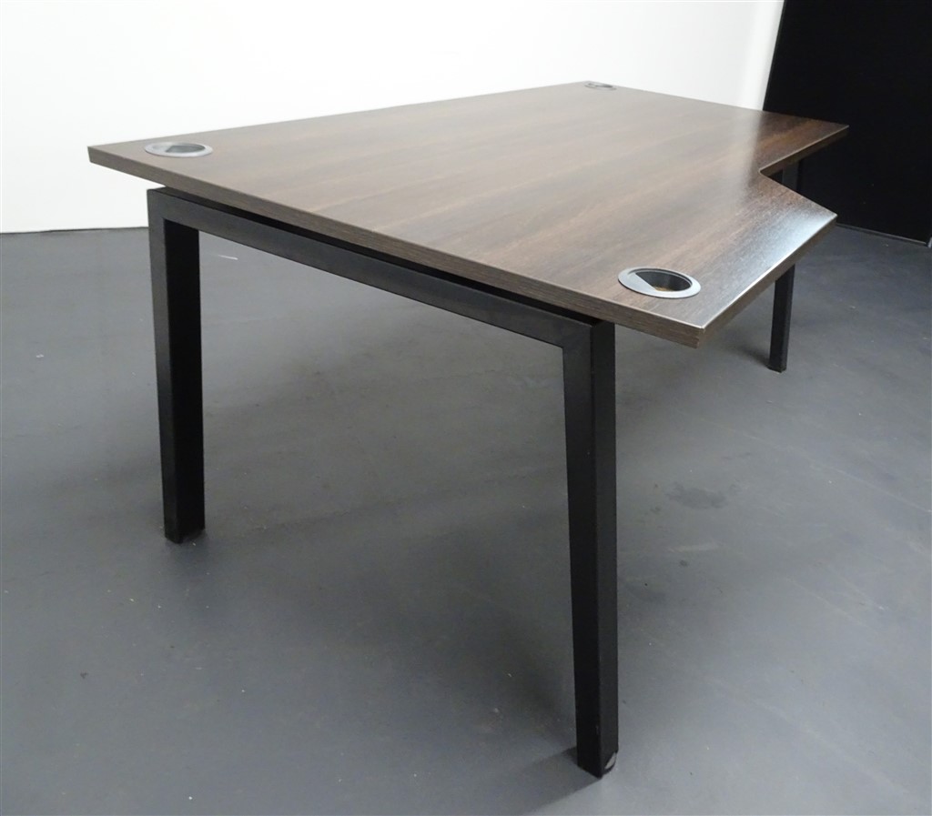 The 1600W Mm Radial Desk offers an ergonomic workspace solution for professional environments. Its distinctive radial shape provides an expanded work surface while maintaining an efficient footprint. The desk features a rich walnut finish that brings natural warmth to a room, contrasted by sturdy black legs. Integrated cable management keeps the workspace organized and free of clutter. This versatile design is suitable for both private offices and open-plan configurations, combining ergonomic functionality with a sophisticated aesthetic.