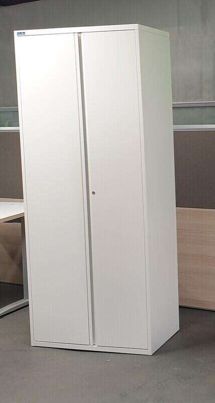 This Silverline tall metal cupboard provides secure and organized storage. It features a two-door design that opens to reveal four internal shelves, offering ample space for various items. Constructed from durable metal with a white finish, this unit is in Grade A condition, indicating it is in excellent shape. The cupboard is lockable for security, and keys can be ordered separately if required. Its tall, streamlined profile makes it a functional addition to an office or workshop.