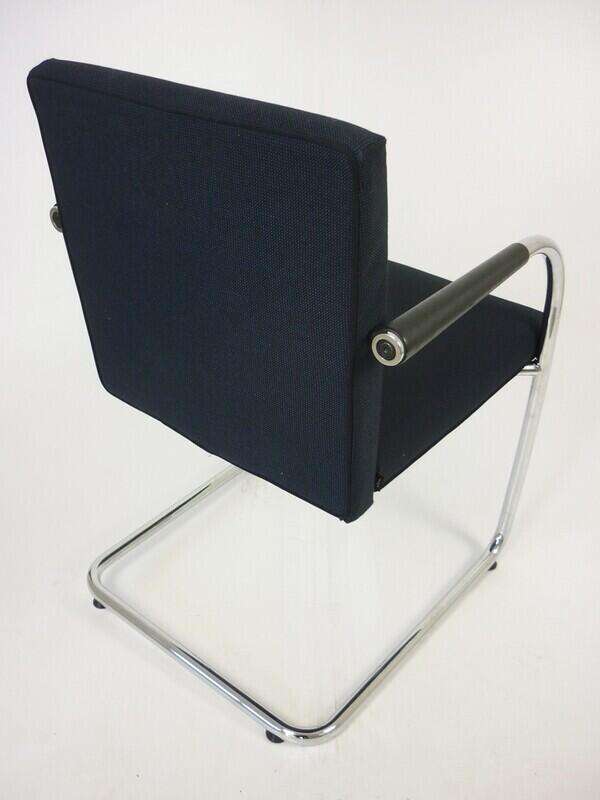 The Vitra Visasoft meeting chair in blue/grey checked fabric features a chrome cantilever frame, polyurethane foam, and leather arms.