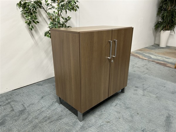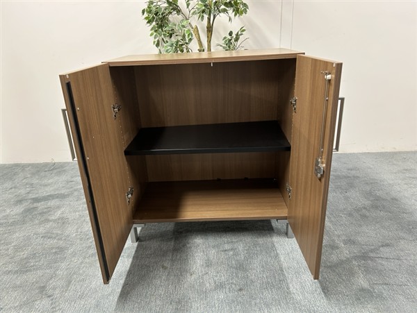 Walnut Office Cupboard with a walnut finish and silver metal legs. This lockable storage unit has an adjustable shelf and silver bar handles.