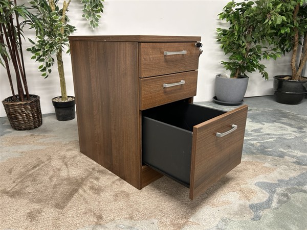 Walnut Pedestals for office storage. This three-drawer unit in a warm walnut finish features a lockable foolscap file drawer for documents.