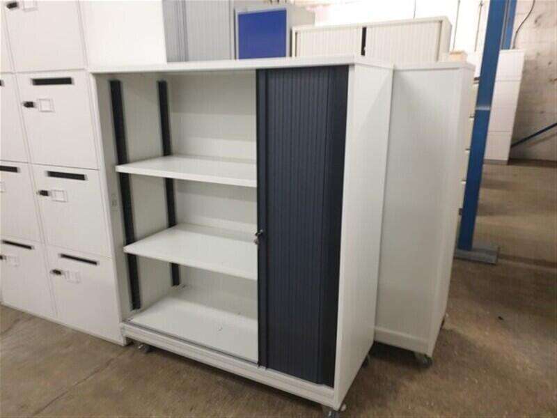 This Gresham tambour cabinet offers versatile storage within a mobile unit. It features a sturdy white wooden surround and a single, space-saving tambour door in a dark grey finish. The interior contains two adjustable shelves, providing customizable organization for office supplies or files. The cabinet is mounted on lockable castors for easy movement and secure placement. While the unit is lockable, keys are not guaranteed to be included with the purchase.