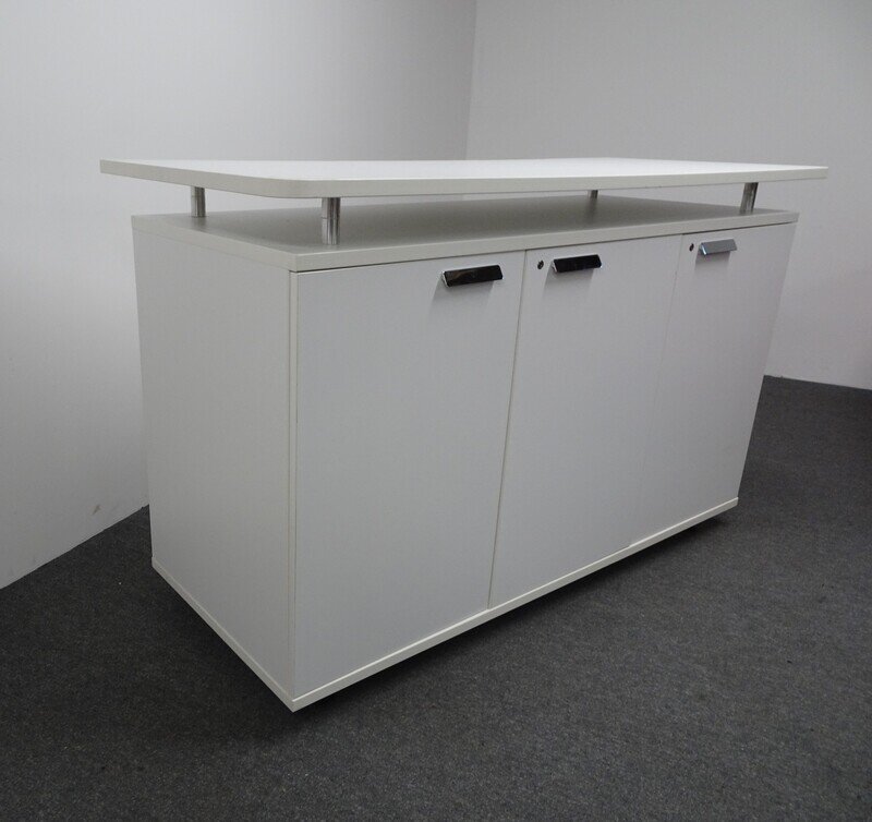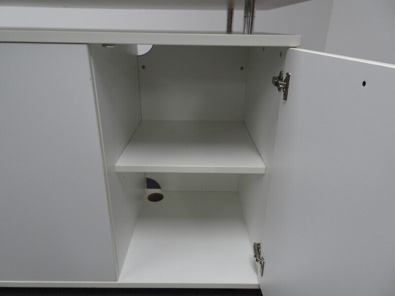 This white wooden credenza provides versatile storage with a clean, modern design. It features three doors with chrome handles, which open to reveal two distinct cupboard sections. The larger double cupboard and the smaller single cupboard each contain one height-adjustable shelf, allowing you to customize the internal space. Both sections also include integrated access for electrical cables, making the unit ideal for organizing office equipment or media devices. The credenza is topped with an extended shelf for additional display or storage.